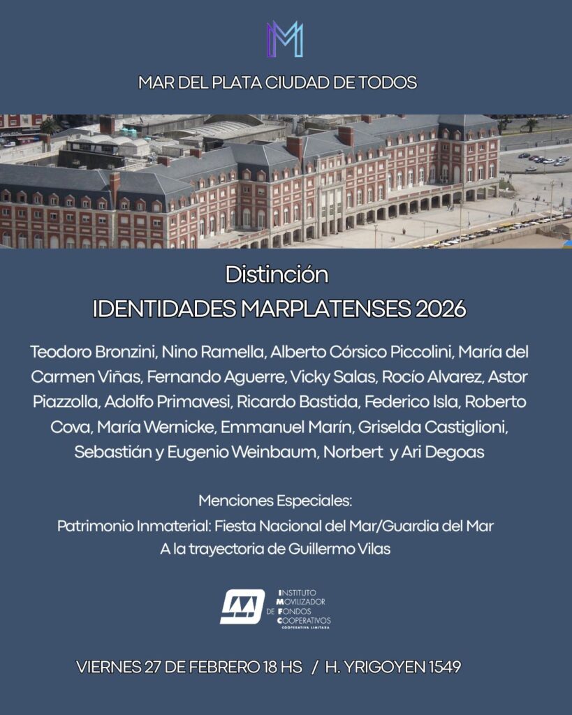 En el marco de las actividades del 152 Aniversario de la Ciudad, la Mesa de Trabajo Mar del Plata Ciudad de Todos anuncia la entrega de las distinciones “Identidades Marplatenses” el viernes 27 de febrero a las 18 hs en el Instituto Movilizador de Fondos Cooperativos, Hipólito Yrigoyen 1549.